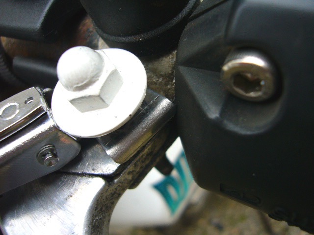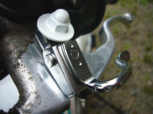 まずはハンドルの左レバーに装着されているブッシュガードを取外し、それを固定していた特殊ボルトだけを戻してクラッチレバーロックを仮装着します。