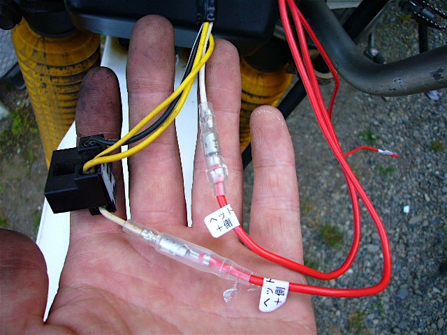 残りの一本はバッテリーのプラス線だったか不使用だったか今となっては記憶が無いものの、指定された配線へと結線しました。念のためジェベルの配線図があれば安心ですが、クルマやバイクにライトや電装品を付けた経験がある人なら、実車の配線状況を見たりテスターを使えば結線する純正配線を探し出すのは難しくないと思います。