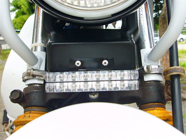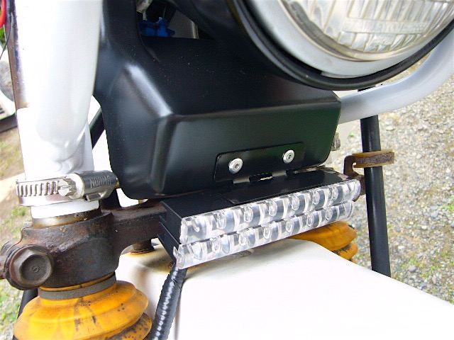 このままでは他の車輌から自分の存在が分かりづらいですし、危険です。そこで以前クルマ用に購入していたブルー発光のデイライトがあったので、これをジェベル125に装着してみることにしました。