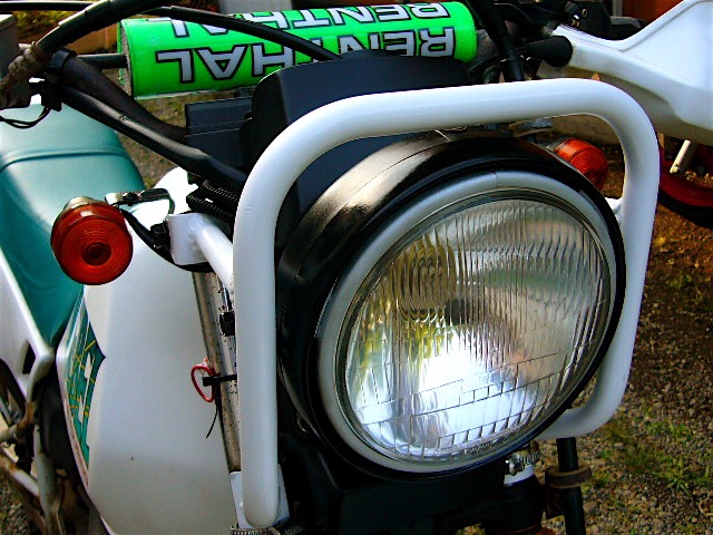 どうすればボンヤリしたヘッドライト回りの印象がシャキッとするのだろうか・・・としばらくジェベ公を眺めていたところ、ふと、このアルミ製のヘッドライトガードの色が印象をボンヤリさせているのではないかと閃きました。