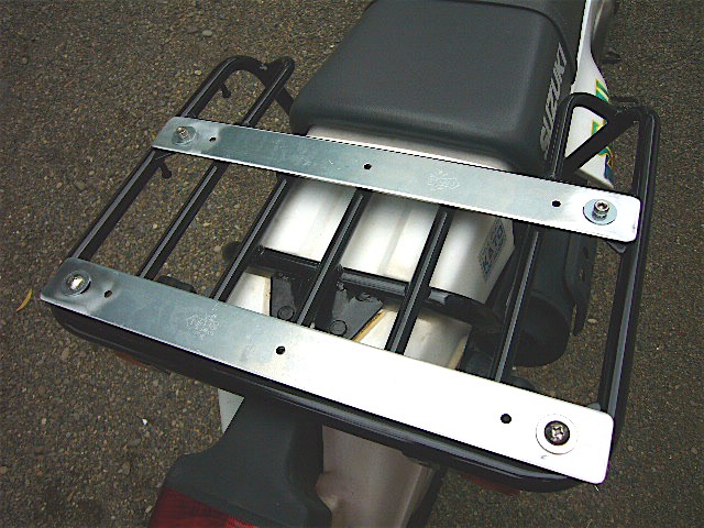 穴を空けた鉄板をDF125のリアキャリアの穴にあてがい、ちゃんと位置がズレていないか、固定できるかを確認しました。