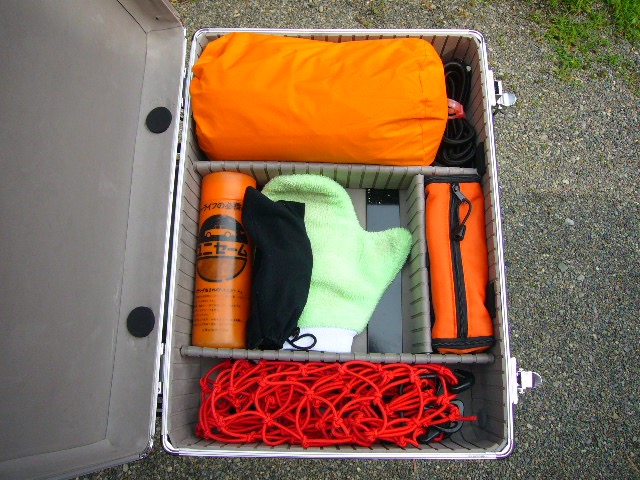 アタッシュケース内には元々仕切りが付属していたので、レインウェア、工具、ツーリングネット、セーム皮(雨天駐車後に濡れたシートに座る時に重宝します)等を整頓して搭載することが出来ました。リアボックスでは仕切りが無いので走行中の振動で中の荷物が暴れてしまいますが、この点でもアタッシュケースのメリットが活かせたと思います。
