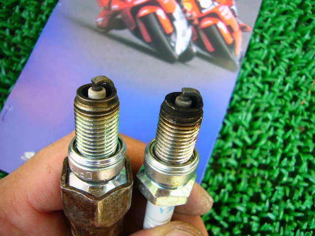 交換後にしばらく走ってプラグを取り外したところ、右側の標準プラグ「DR8EA」よりも左側の熱価が一段焼け型である「DR7EA」のほうが健康そうなプラグの焼き色をしていました。
