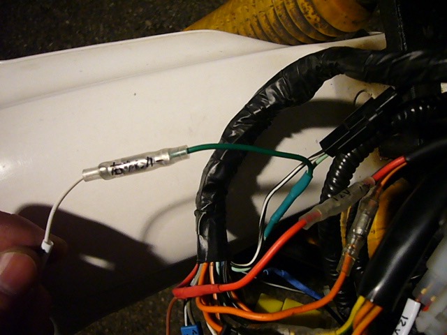 そこで純正インジケーターランプにつながっていたウィンカー警告灯ではなく、実際にヘッドライト横にあるウィンカーランプにつながる配線から分岐してACEWELLメーターの左右それぞれのLEDランプに接続するという方法をとりました。