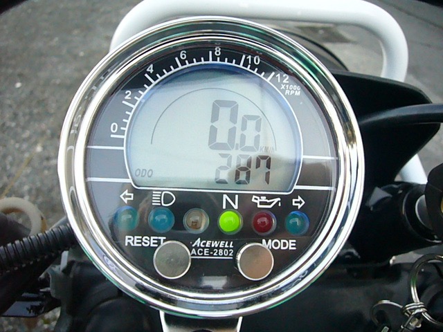 そして結線終了後にとりあえずバッテリーを繋いでからキーをひねり、本体表示の切り替え、各ランプの動作を無事に確認し、これでひとまずACEWELLメーターへと純正配線を流用した結線が完了しました。