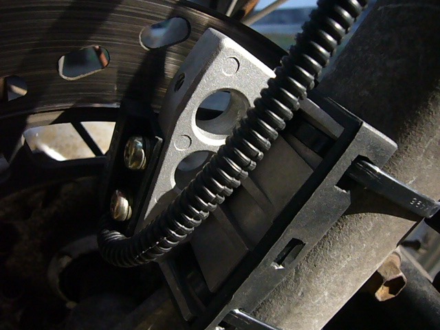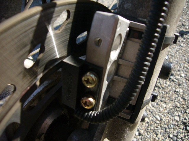 ACEWELL社とKOSO社は別メーカーなのですが、マグネットセンサー自体はどこか同一規格の物を使っているらしく、KOSOメーターに付属していたフロントフォーク装着用のステーにある取り付けネジ穴と、ACEWELLメーター用のマグネットセンサーの取り付け穴がぴったりと一致したのは驚きました。お陰でわざわざネジ穴を新たに開けずに済みました。
