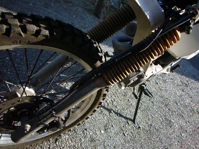 そしてコルゲートチューブを被せてからビニールテープを巻いて処理したマグネットセンサーコードをフロントフォークに沿わせて、数カ所タイラップで固定していきました。フロントフォークのゴムブーツ部分はショックを吸収する際に伸び縮みするため、この間のコードは伸びた時も大丈夫なくらい余裕を持たせて端と端をタイラップで固定しておきます。