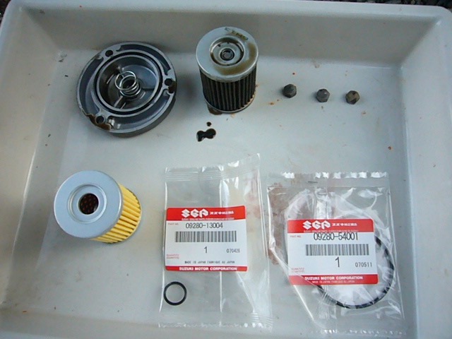そしてジェベルオイルジョッキに新品エンジンオイルを規定量の0.85リッターほど注ぎ、新品のOリングには新しいエンジンオイルを軽く指で塗ってなじませてから取付部品が揃っているかを確認します。