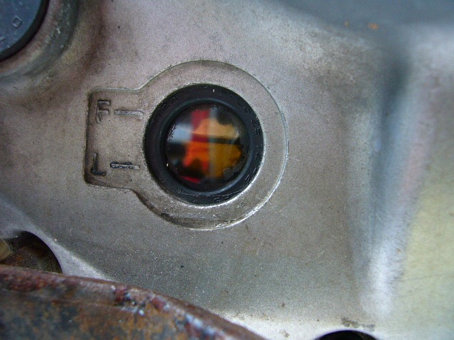 ジェベル125には透明のオイルレベル確認窓があるので、ここから覗けばエンジンオイルの色や量がすぐに分かります。他のバイクやクルマは注入口からゲージを差し込んで、一旦ボロ布でオイルを拭きとってから差し込んで量を確認しつつ、オイルの色を確認するという方法が普通なので、ジェベル125のこの確認窓はとても親切な設計だと思います。